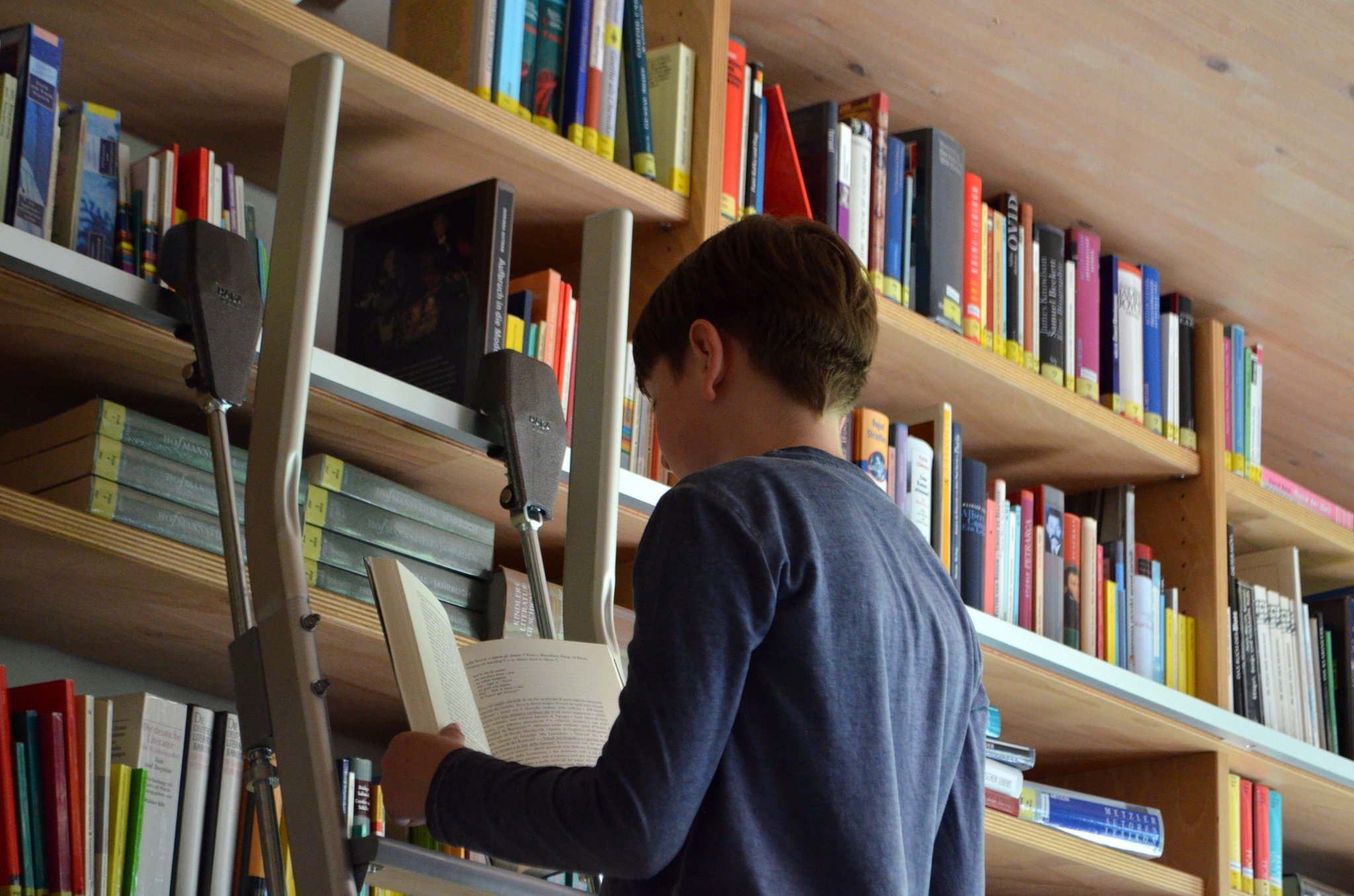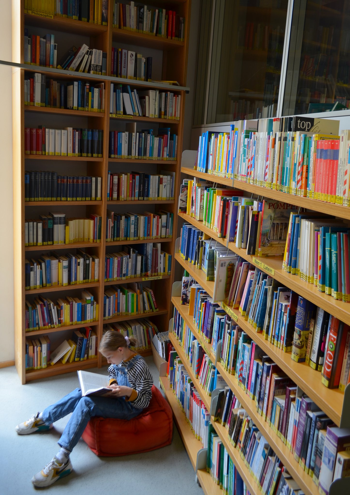 Die Bibliothek ist für die Schüler und Schülerinnen außerdem ein gemütlicher Raum zum Schmökern, der sich in Pausen großer Beliebtheit erfreut. Plätze zum Arbeiten sind auch vorhanden.
